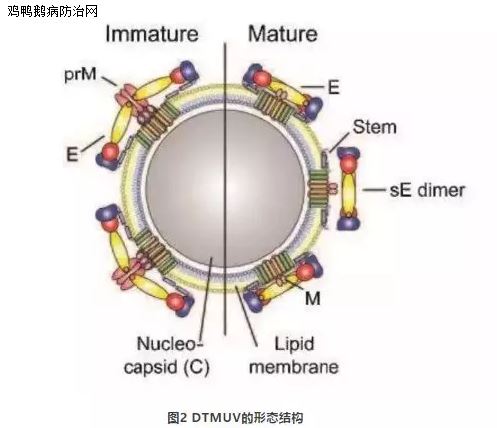 该病具有黄病毒的典型形态特征:病毒粒子为直径40-50nm的球形结构,病毒RNA被二十面体对称的核衣壳包裹,核衣壳的外层包有表面有棘突的脂质囊膜。