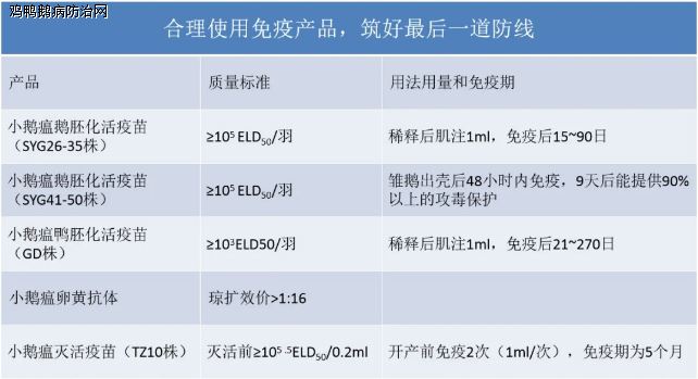 目前市场上防控小鹅瘟的产品有很多,包括小鹅瘟鹅胚化活疫苗(SYG26-35株),小鹅瘟鹅胚化活疫苗(SYG41-50株),小鹅瘟鸭胚化活疫苗(GD株),小鹅瘟卵黄抗体,小鹅瘟灭活疫苗(TZ10株)等。小鹅瘟鹅胚化活疫苗(SYG26-35株)、小鹅瘟鸭胚化活疫苗(GD株)和小鹅瘟灭活疫苗(TZ10株)主要用在种禽上,卵黄抗体主要用于雏鹅的防控。