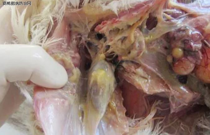 剖检可见支气管栓塞的鸡只,气管出血,支气管以及肺部有明显的黄色干酪样栓塞物。气囊中有黄色干酪样物,肺脏淤血,水肿,坏死。腹膜炎,腹膜上有明显的混浊样分泌物,感染严重的呈明显的包心包肝症状,分泌物为黄白色干酪物。