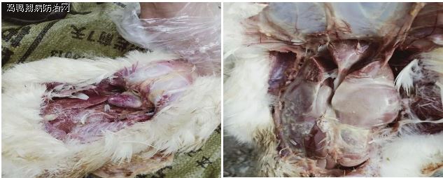 对病鸭进行剖检,主要症状为气囊炎、心包炎,腹膜炎、肝周炎。通过临床症状及剖检症状诊断为通风不良引起的细菌感染。