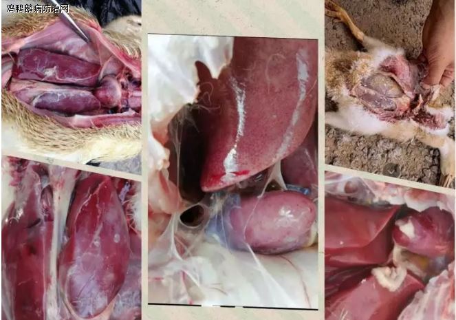 最明显的大体病变是浆膜表面的纤维素性渗出,以心包、肝脏表面和气囊最为明显,脾脏肿大,呈斑驳状。