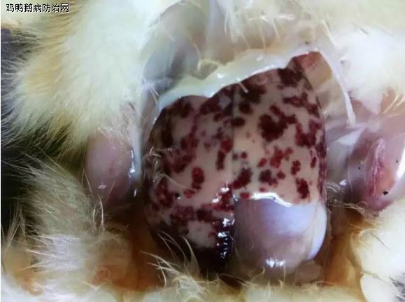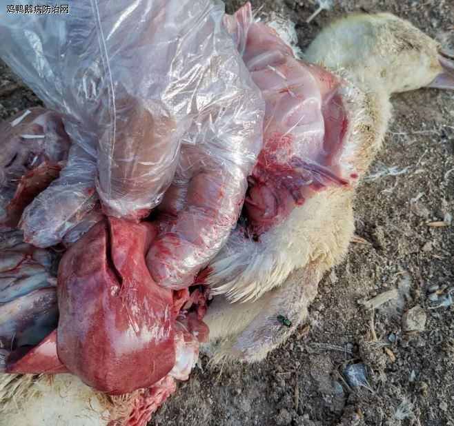 雏鸭怕冷,常挤成一堆,番鸭精神委顿,全身乏力、脚软或拐脚。肛门周围有白色或淡绿色稀粪。剖检见肝脏、脾脏肿大或稍肿大,表面和切面有弥漫性、大小均匀、灰白色坏死点,脾脏的白色坏死点比肝脏上的白点略大,发病后期雏鸭见心包膜严重。成年鸭未见发病。如图二所示: