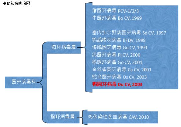 最早在2002年,德国科学家Hattermann 发现勃兰登堡某养鸭场的法国番鸭表现出羽毛凌乱、生长迟缓、体重减轻等症状,认为这与其他禽类感染圆环病毒后的临床特点很相似,于是对样品进行负染电镜(EM)检测发现,法氏囊中存在无囊膜的球状病毒,直径大约为 15~16nm。最终根据圆环病毒rep基因的鉴定,发现与其他圆环病毒同源性仅39%~60%,与鹅圆环病毒同源性最高,但也仅为82%。推断新发现的可能为新的圆环病毒,鸭圆环病毒DuCV。
