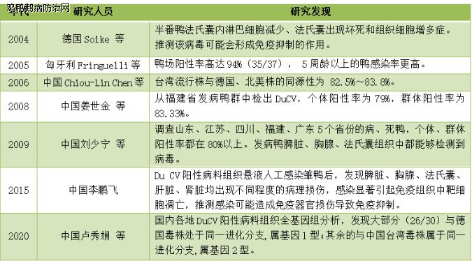DuCV在世界范围内的鸭群广泛存在,在国内的情况也是如此。鸭个体、群体感染率都很高,病毒主要攻击鸭的脾脏、胸腺、法氏囊等免疫器官,发现国内分为DuCV-1、DuCV-2两种基因型。