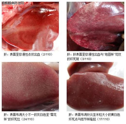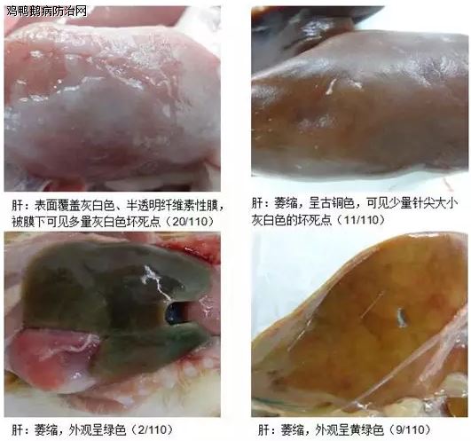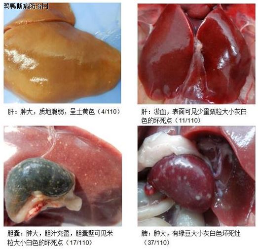 本研究对110例水禽沙门菌病的临床病例进行全面的剖检检查比较,该病病例主要在发病的急或慢,肝、脾、胰腺、胆囊的病理变化和是否出现纤维素性心包炎、肝周炎上存在不同临床表现特征,大致可以将其临床表征归为5种类型。