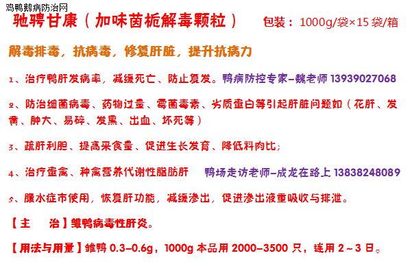 5、使用优质抗霉菌及降解霉菌毒素的药物,保护肉鸭肝脏细胞,解除免疫抑制,增强免疫力,如1-10日龄使用植物精油无抗原料生产的“驰骋甘康+好得快或芪花益草+生命核能+驰骋EAD乳液”;克真霉连用3-4天,一个产品解决霉菌和霉菌毒素两大问题,质量可靠,疗效优良。10日龄之前使用5天。花小钱,解决大问题!
