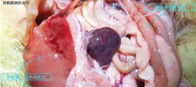 伤寒沙门氏菌:中大鸭散发较多,多伴发大肠杆菌、浆膜炎、多种病毒病。大群采食差、病鸭多呼吸困难、软脚瘫痪,拉白绿稀便,脾脏呈大理石样坏死,肝脏肿胀发黄绿色,肺部炎症及心肌坏死包心较多,肠道明显卡他性炎症,肠壁变薄充气。