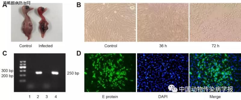 作者在临床研究中发现感染鸭坦布苏病毒的鹅群表现出明显的神经症状,同时伴随着精神沉郁、厌食、共济失调等症状。随后,通过鹅胚和BHK-21细胞成功分离到1株鹅源鸭坦布苏病毒,将其命名为DTMUV/Goose/China/2019/AQ-19 strain。