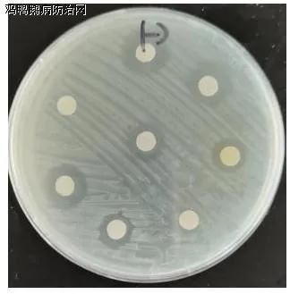 无菌取麦康凯平板和血平板上分离到的细菌,涂布MH平板,按箭头方向贴药敏纸片:普疾宁(氟苯尼考)、肠欣安(新霉素)、强力霉素、头孢、粘杆菌素、安普霉素。结果如下: