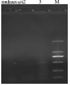图中1-3分别为送检鸭组织样品的ND(副粘病毒)、H9(禽流感)和DFV(黄病毒),M为DNA标志结果显示,送检鸭样品检测到H9亚型禽流感病毒,未检测到副粘病毒和黄病毒。最终确诊为H9亚型流感继发传染性浆膜炎与大肠杆菌病。