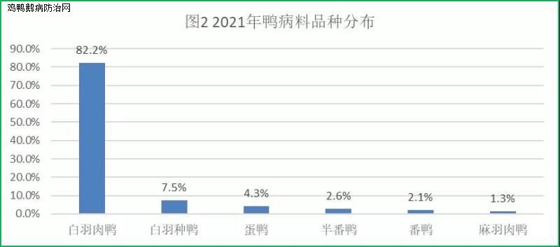 如图2所示:送检的鸭病料主要集中在白羽肉鸭,占鸭总病料数的82.2%,其次是白羽种鸭(7.5%)、蛋鸭(4.3%),番鸭、半番鸭和麻羽肉鸭检测病料数较少。