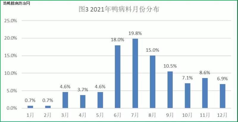 如图3所示:送检的鸭病料主要集中在6-8月份,此季节正值鸭病高发期。