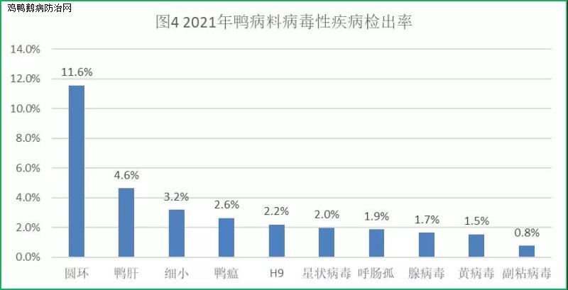 如图4所示,鸭圆环检出率最高,高达11.6%,其次鸭肝(4.6%)、细小病毒(3.2%)、鸭瘟(2.6%),其它病毒,如H9、星状病毒、呼肠孤病毒、腺病毒检出率更低。