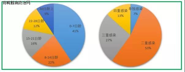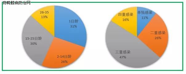 3.1 流行动态:多为7日龄之前感染,占比可达41%,成年种鸭以前很少表现临床症状,现在能表现出明显临床症状,感染后多为瘫痪、运动障碍,关节肿大,单侧腿肿大明显。单独感染较少,只占7%,其余93%多为混合感染,其中二重感染比较普遍。