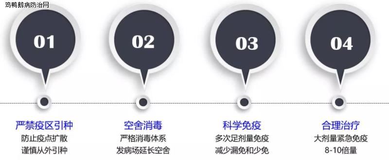 ① 坚持自繁自养:不从疫区或疫场购进雏鸭,平时加强卫生消毒,定期用10%石灰乳或驰骋一片净1-3片兑1升水消毒、清洗鸭舍用具、蛋框、料槽、水线。