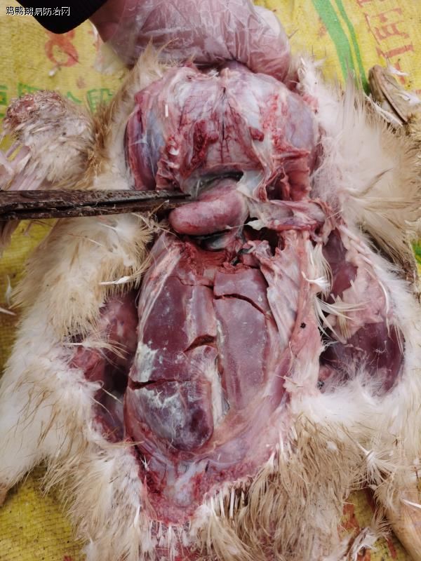 剖检病死鸭可见,全身多处浆膜表面出现纤维素性渗出,主要集中在心包膜、肝脏、气囊,形成典型的“三炎”病变——心包炎、肝周炎、气囊炎。脾脏肿大瘀血,呈大理石状,肾脏充血水肿。同时可见脑膜炎,脑膜充血、出血。极个别病例可见跗关节单侧或双侧肿大,关节腔有积液,触之有波动感,剖开可见大量液体流出。