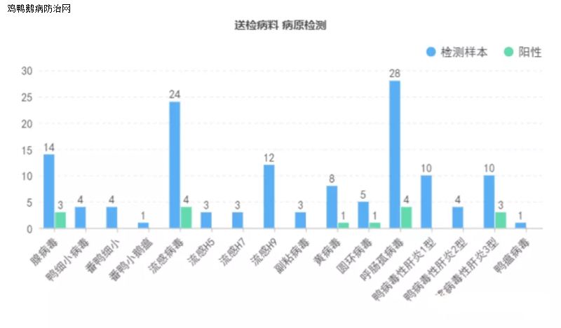 结果表明:在一季度,鸭病毒性肝炎3型、呼肠孤病毒、流感病毒、鸭腺病毒、黄病毒的检测样本基数相对较大,在检测送检样本鸭肝炎病毒3型、呼肠孤病毒、流感病毒、鸭腺病毒的阳性检出率在10%-30%。