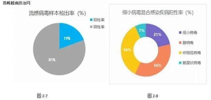 共检测病料31份,具体情况见图图2-7,2-8;样本阳性检出率为19%,常见呼肠孤病毒、腺病毒、细小病毒、鹅星状病毒等混合感染。