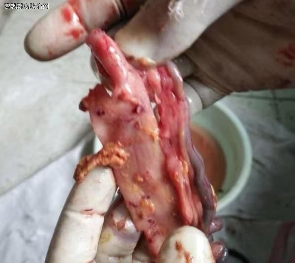 剖检病死鹅可见:气管、肺轻微出血,腺胃乳头充血水肿,甚至出血,腺胃与食道交界处、腺胃与肌胃交界处有轻微溃疡,脾脏表面及切面可见灰白色或淡黄色针尖大小至粟粒大小的坏死灶。十二指肠、空肠、回肠黏膜可见大小不一的溃疡灶,部分鹅心冠脂肪有出血点。