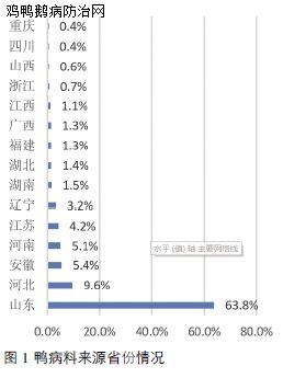 送检鸭病料主要来自山东,占鸭病料总数的63.8%;其次是河北,占9.6%;然后是安徽(5.4%)、河南(5.1%)、江苏(4.2%)、辽宁(3.2%)等地。送检的鸭病料中,来自白羽肉鸭的最多,占总病料数的82.2%;其次是白羽种鸭,占7.5%;第三位是蛋鸭,占4.3%;而来自番鸭、半番鸭和麻羽肉鸭的检测病料数较少。详见图2。