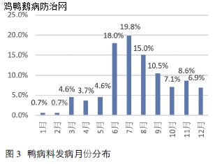 由于大肠杆菌病已成为常规性疾病,防控措施从业者较为熟悉,在此不再赘述,本文重点对鸭病毒性肝炎、鸭细小病毒病、鸭呼肠孤病等病的防控措施进行阐述。1)流行动态。从感染病例相关信息记录发现,感染日龄主要集中在20~30日龄,占鸭肝病例数57.1%;流行血清型主要是3型,占74%;其次是血清1型,占26%。肉鸭后期感染引起鸭肝症状不典型,肝脏出血不明显,心包积液明显。2)防控措施。加强种鸭免疫,提高母源抗体;加强孵化环境控制,严格消毒,避免交叉污染;加强饲养管理,提供舒适环境;加强生物安全措施,做好消毒和隔离工作;加强抗体注射,在1~3日龄选择高效价的鸭病毒性肝炎精制卵黄抗体进行注射预防。1)流行动态。分析感染病例发现,感染日龄还是在早期,只是临床表现往后延迟,1日龄细小病毒检出最高,高达31%。混感现象比较多见,其中三重比例最高,高达47%,单独感染较少,只占11%。临床表现减轻,断腿、断翅、长舌鸭出现比例减少,一般都在5%以下。多表现运动障碍,出栏时整体体重减少5%~10%,特别小的鸭出现比例极小。 2)防控措施。加强种鸭免疫,减少种鸭带毒,提高母源抗体;加强孵化环境控制,严格消毒,避免交叉污染;加强饲养管理,尤其是控制好鸭舍温度和湿度;加强生物安全措施,做好消毒和隔离工作,防止水平传播;加强抗体注射,1~3日龄注射高效价的小鹅瘟精制卵黄抗体,根据鸭场及周边发病情况,采取2次注射和增加注射剂量方式进行合理预防。1)流行动态。分析感染病例发现,多发生于日龄较小的鸭群,尤其是2周之前占比最高,可达63%,临床表现主要是运动障碍和脾脏坏死。成年鸭感染有变化,以前临床症状不明显,只是带毒,现在能表现出明显临床症状,感染后多为瘫痪、运动障碍,关节肿大,单侧腿肿大明显。混感现象比较普遍,占比可达93%,单独感染只占7%。2)防控措施。加强种鸭免疫,减少种鸭带毒,提高母源抗体;加强生物安全措施,做好消毒和隔离工作,防止水平传播;发病时采取抗生素防止继发感染,同时用提高机体免疫力的药物。1)流行动态。2021年发病有所下降,主要是肉鸭发病有所下降,蛋鸭和种鸭都是零星发病。感染日龄拓宽,以前主要成年鸭,现在50~60日龄就开始发病。呈现明显的区域性。2)防控措施。严禁疫区引种,防止疫区扩散;严格空舍消毒和延长空舍时间;科学免疫,蛋鸭和种鸭开产前要进行3次免疫,肉鸭2~3周免疫1次;发病时要鸭瘟活疫苗大剂量注射,根据发病日龄选择6~10倍量紧急注射。1)流行动态。从2021年检测来看,发病大大下降,表现零星发病。蛋鸡和种鸡自2020年开始感染发病以来,整体比较平稳,主要在南方区域。蛋鸡和种鸡感染引起临床表现与蛋鸭和种鸭一样,主要引起产蛋下降,下降幅度较大,一般20%~40%。肉鸭感染主要是以脑炎为主神经症状,导致瘫痪、运动障碍,死淘率加大。2)防控措施。加强生物安全措施,做好消毒和隔离工作,尤其做好防鸟灭蚊工作;做好疫苗的免疫,种鸭开产前免疫2~3次鸭坦布苏病毒病活疫苗,肉鸭5~7日龄免疫1次。