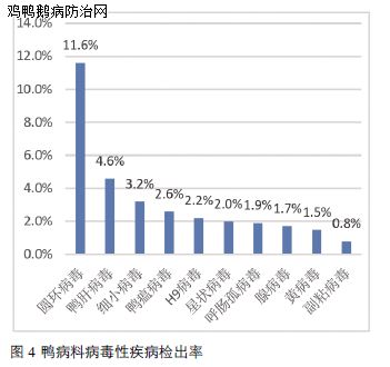 鸭病料发病月份分布情况见图3。从图3了解到,送检的鸭病料发病时间主要集中在6~8月份,此阶段由于高温高湿、环境控制难度大,属于肉鸭难养季节。 采用PCR法检测,从病毒性病原检出率来看,鸭圆环病毒检出率最高,为11.6%;第二是鸭肝炎病毒,检出率为4.6%;细小病毒、鸭瘟病毒,检出率分别是3.2%、2.6%,其它病毒如H9、星状病毒、呼肠孤病毒、腺病毒检出率较低,从2.2%~0.8%不等。详细见图4。