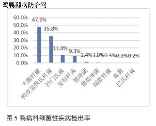 采用PCR法检测,大肠杆菌在鸭细菌性疾病检出率最高,高达47.9%;第二位是鸭疫里默氏杆菌,检出率为35.8%;沙门氏菌排列第三位,检出率为11%;第四位是变形杆菌,检出率为9.3%;其它细菌检出率较低。细菌性疾病的检出情况见图5。