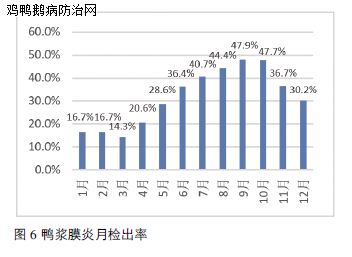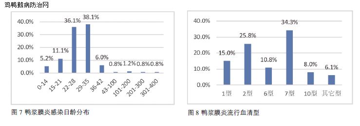 1)流行动态。各月份均可感染,但是主要集中在高温季节,检出率4~5月份开始增加,9月份到达高峰,检出率高达47.9%,之后开始下降。感染日龄主要集中在22~35日龄,这阶段检出率高达74.2%。流行血清型主要集中在5个血清型,其中7型34.3%、2型25.8%、1型15.0%、6型10.8%、10型8.0%。鸭传染性浆膜炎流行动态情况见图6~8。