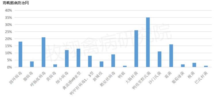 根据驰骋禽病研究院禽病统计站点数据,对本月水禽疾病检出率进行简单分析,主要通过病毒性、细菌性疾病分类阐述。