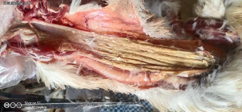 典型病例检测到禽偏肺病毒,属于肺病毒科偏肺病毒属,特征病变见于输卵管,输卵管明显膨大,内含透明或轻度浑浊的渗出液,积液中见有白色凝固物或蛋白样的白色絮状物;卵泡膜充血出血,卵泡变形破裂,子宫部有成形鸭蛋,肝脏充血,发病4-5日后,有些病例的输卵管内已无积液,可能由泄殖腔流出,但在输卵管和子宫部内见有凝固的渗出物,偶见子宫粘膜充血。
