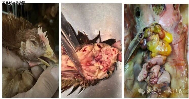 感染鸡肿脸、鼻腔干酪物和卵泡变形、液化