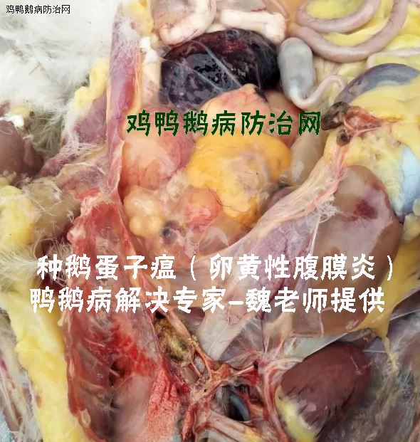病母鹅腹腔充满淡黄色恶腥臭液体和破坏了的卵黄,腹腔器官表面有淡黄色,凝固的纤维素性渗出物,而剥离肠系膜有针尖大小出血点,输卵管腔内有软壳蛋滞留,蛋壳表面粗糙,并附着脱落的粘膜或凝固的蛋白。卵巢内的卵子变形皱缩或成硬块。公鹅阴茎表面有芝麻或绿豆大小的结痂,剥去结痂为溃疡灶。