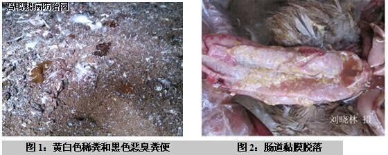 1、肠道黏膜脱落(如图2)、空肠和回肠极度扩张,充满液体,十二指肠粘膜表面覆盖一层黄白色恶臭的纤维素性渗出物和坏死的肠粘膜。
