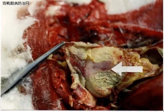 病死鸭剖检可见最明显为纤维性心包炎,肝周炎,气囊炎及脑膜炎,(但纤维性渗出物较薄,清亮,一般较湿润,不浑浊,心包液增多。脾脏肿大,呈大理石样。个别肝肿大,并有针尖大的灰白色坏死灶。打开腹腔一般臭味,胆囊肿大,少数病鸭关节肿胀有浓性分泌物。病程较长的鸭,全身脱水严重,皮肤不易剥离。
