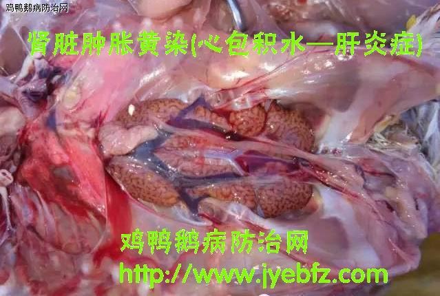 剖检可见病鸡心肌柔软、心包积有淡黄色透明的液体,液体遇冷可凝固;肝脏肿胀、质地变脆,个别死亡鸡可见脾脏肿大,肺脏淤血。发病鸡肝脏中央静脉和窦状隙广泛淤血、肝细胞严重脂肪变性,同时细胞浆和细胞核内可见嗜碱性包涵体。推测病因为腺病毒使肝脏受损,肝脏的受损造成白蛋白合成减少,引起胶体渗透压减少,血管通透性增加,引发心包积液,肺脏的缺氧又可以加剧心脏负担,加剧心包积液。