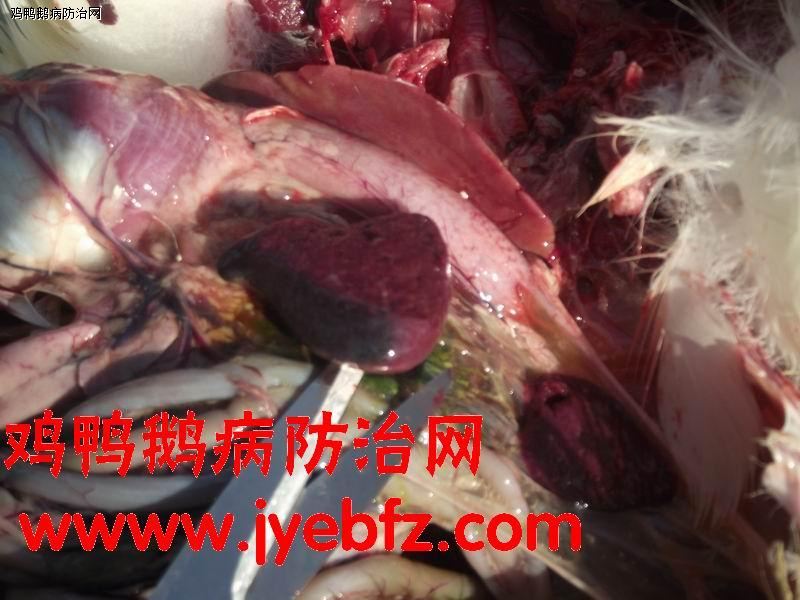 发病初期急性死亡,脾脏肿大出血,严重者紫葡萄状,病程稍长者常死于继发感染,脾脏变形,表面如同核桃皮状凹凸不平,或出现小米粒至绿豆粒大小的不规则坏死灶,严重者后期脾脏萎缩消失,肝脏肿大,有针尖状灰白色坏死点或出血斑点。
