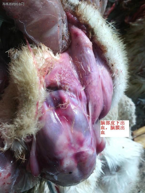 腿肌内侧脂肪出血,胸肌、腿肌条纹状出血,心脏脂肪出血,心肌出血,肾脏肿大出血,腺胃出血,肌胃脂肪出血,肌胃角质层下出血,肠道黏膜出血,肺脏出血,严重时呈青铜色坏死,气管黏膜出血,有大量黏液渗出。如继发大肠杆菌病,剖检可见肝周炎和心包炎,腹膜炎等变化。