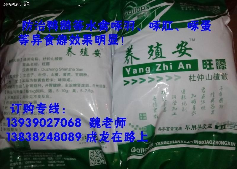 冬季可补充青料汁或添加0.75%养殖安+复合维生素B(按每公斤料加2-5毫克)。若一时弄不清啄羽原因,可在饲料中加入0.75-1%的养殖安,在饮水中添加驰骋EAD乳液,连用7天;同时改善饲料管理,消除各种不良因素或应激原的刺激,如疏散密度,防止拥挤;室内温度、湿度适宜,注意通风;防止强光长时间照射;育雏期可适量加入青粗料,以增加雏鹅饱腹感。如将青绿料扎成小捆,挂在一定高度,分散雏鹅注意力,补充所缺乏的营养物。
