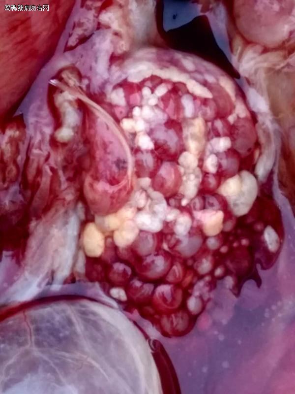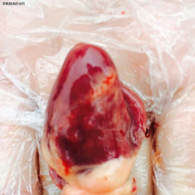 病死鸭眼睑发红,呈急性角膜炎,鼻孔处沾有污物,气管内无明显出血。食道无出血变化,但黏液增多,心内膜、心肌有炎症,心冠脂肪上有轻微出血点。肺肿胀,质地变脆、易碎。有的呈心包炎、肝周炎。十二指肠黏膜有瘀血斑,胰脏有实质性肿胀和大小不等的白色占状病变,肾脏有轻微肿胀。卵巢、卵泡、卵黄膜变形呈暗紫红色带,严重者卵黄畸形,易破裂。输卵管上端变细,下端内有软壳、酥壳蛋,输卵管末端黏膜呈弥漫性瘀血炎症。回空肠内变化不大,盲肠扁桃体有轻度岛屿状肿胀出血,直肠变细,有有黄色绿色稀便,直肠内壁黏膜呈紫红或暗红色病变。肛门括约肌松弛,呈炎性症状,肛门周边羽毛被粪便和异物污染。