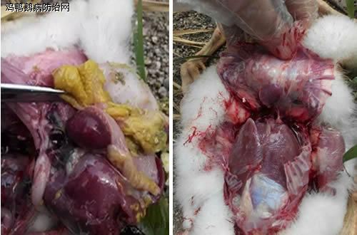 可见肠道的血管怒张,十二指肠的粘液增多,粘膜呈现橘黄色,小肠中后段膨大增粗,肠壁变薄,里面有容易剥离的凝固性栓子。肝脏肿大,呈棕黄色,胆囊明显膨大,充满蓝绿色胆汁。胰腺颜色变暗,个别的胰腺出现小白点。心肌颜色变淡,肾脏肿胀。法氏囊质地坚硬,内部有纤维素性渗出物。有神经症状的鹅剖检时,可见脑膜下血管充血。