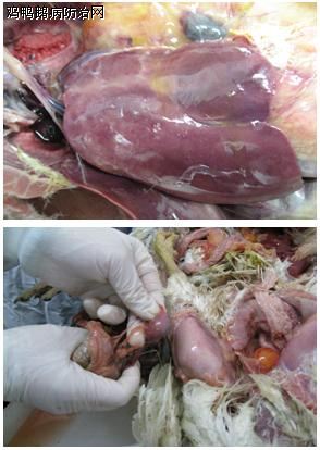 (3)产蛋鸡感染时,可造成产蛋下降5-20%,少发生死淘,有轻微的呼吸道病。剖检主要见呼吸道有黏液分泌和支气管、喉头充血,卵泡充血、淤血。输卵管和子宫内有粘性分泌物。