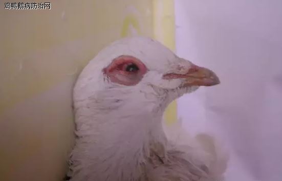 本病的主要特征表现为眼结膜炎、鼻炎和腹泻。一般发病急,常见于幼鸽,2~3周龄的幼鸽发病时死亡率高,发病4~15 d因消瘦、腹泻而迅速死亡。病鸽表现为精神不振,食欲不佳,饮水减少甚至拒食;呼吸困难,呼吸音粗;腹泻消瘦,拉绿色、灰色或黑色稀便,肛门周围羽毛粘有粪便;两爪向内弯曲,站不稳。部分病鸽表现出一侧性眼结膜炎,眼睑严重增厚,流泪畏光,衣原体感染初期流出水样物,眼睑轻度红肿(见图1);感染中期眼睑中度红肿(见图2);感染后期眼睑红肿,眼内有脓性分泌物(见图3)。衣原体严重感染,眼睑严重红肿(见图4)。衣原体感染病程长者,眼睛内有黄白色脓性分泌物(见图5);病程长且严重者,眼睛大量的分泌物将一侧眼睛和脸面全部糊住(见图6)。病初鼻孔有水样分泌物,后期为黄色黏液性分泌物,个别的还可见单侧鼻孔有干酪样物堵塞。