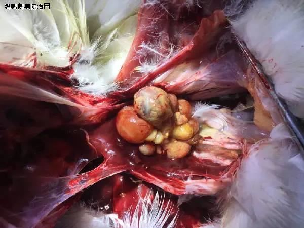 产蛋鸭感染后,可见脑膜出血、脑组织水肿;肝肿大出血;脾脏斑驳状大理石样花纹;胰腺液化坏死;心冠脂肪有出血点,严重者心脏内膜和外膜都有出血;卵巢发育不良,卵泡变形、萎缩,卵泡膜严重充血出血,严重者卵泡发生破裂并形成卵黄性腹膜炎,输卵管水肿并伴有粘液性渗出[6]。