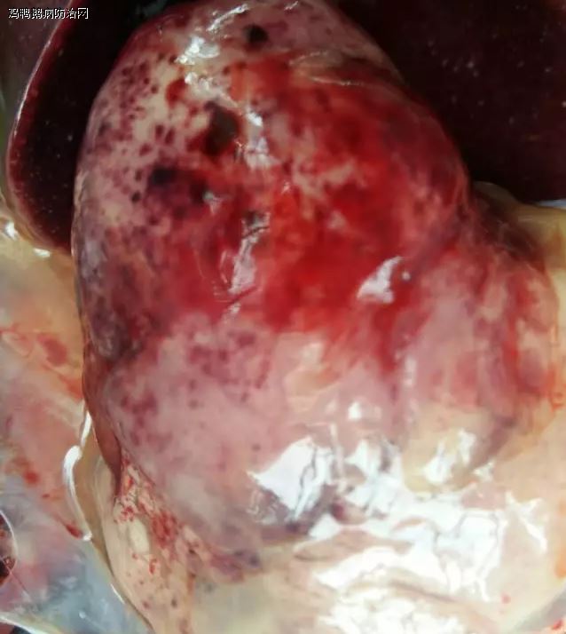 鸭霍乱分为最急性、急性和慢性,其中最急性霍乱发病时无任何的症状,鸭多在吃食时或在吃食后突然抽搐、倒地死亡。一般在肥壮鸭群和高产鸭群中多发。急性霍乱是最为常见,当发病时病鸭会表现为精神萎靡不振,停止呜叫,不愿运动和下水游泳,即使下水,在水中也不活动,常落在其他鸭的后面或者独自蹲在一边,双眼无神,呈半闭状。一般病鸭还会表现为羽毛蓬乱,两翅下垂,缩颈低头.食欲减退或者废绝,渴欲增加,体温升高,可高达43~44℃,会在发病后的1~2天死亡。病鸭的嗉囊内充满气体,有的则有积食或积液,口中和鼻腔内会流出泡沫状的黏液,出现咳嗽、呼吸困难,病鸭为了排出喉头内的黏液会频繁甩头。病程较长的病鸭会下痢,初期粪便为粥样,后来变为灰白色、灰黄色或者黄绿色的黏液,最后呈绿色水样,带有腥臭味,有少数病鸭排出的粪便还带有血液,并且恶臭。有部分病鸭会在后期出现两脚瘫痪,不能行走的现象,这类病鸭常在1~3天内死亡,康复的几率很小。慢性霍乱是由急性耐过不死者转变而来,常见于流行病的后期,表现为持续的下痢,体质消瘦,翅膀不灵活,一侧肢或者两侧的下肢关节肿胀,局部发热、疼痛,跛行,行走困难。病程较长的病鸭,肿胀的关节会变硬,导致完全不能行走。