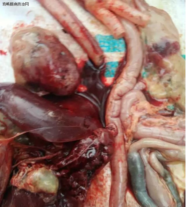 急性霍乱病例进行剖检主要表现为败血症,其中以十二指肠的出血最为严重,会发生较为严重的急性卡他性肠炎或者出血性肠炎,肠内容物含有血液。剖检会发现肝脏肿大,颜色变浅,质地变硬,在肝脏的表面散布有针尖大小并且分布均匀的黄色或者灰白色坏死点,有的还有纤维素性渗出物。脾脏略有肿大,质地柔软。在心外膜下或者浆膜下可见点状或者片状的出血,心包积液、增厚,积蓄了大量淡黄色絮状渗出物,有的还有纤维素性的凝块,肺部表现为充血,外表有出血点,有的有肺炎。切开病鸭肿大的关节会有稠厚的灰黄色酷样渗出物。产蛋母鸭的卵巢外表的血管不清;慢性霍乱对多器官都有入侵,并且病理变化存在差异。有的表现为鼻腔和上呼吸道内有积液,有的则在关节和腱鞘内蓄积有浑浊或干酪样的渗出物。肝脏略有肿大,颜色为土黄色,质地柔软,表面布满了针尖大小的灰黄色坏死点,胆囊肿大,其中充满绿色油状液体。病鸭的眼角膜下有出血小点和浅表溃疡,心外膜也有出血点,有明显的心包积液,呈淡黄色,透明,其中混有纤维素。产蛋母鸭的卵巢会发生明显的变化,卵子的外形不整齐,质地柔软,有时还会出现淡绿色的卵子,在卵巢的周围还有一种坚实、黄色的干酪样物质,有时会黏在内脏器官的表面。