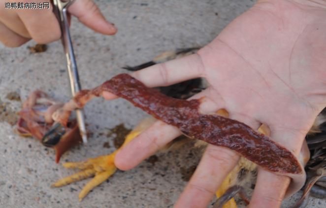 肠壁变薄,黏膜脱落,肠内容物呈蛋清样、粘脓样,个别鸡群表现得特别严重,肠黏膜几乎完全脱落崩解,肠壁变薄,肠内容物呈血色蛋清样或粘脓样、西红柿样。