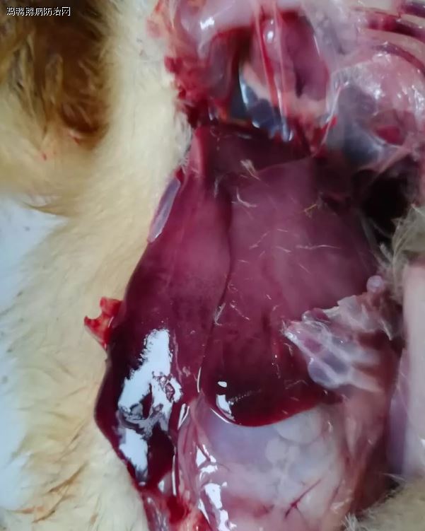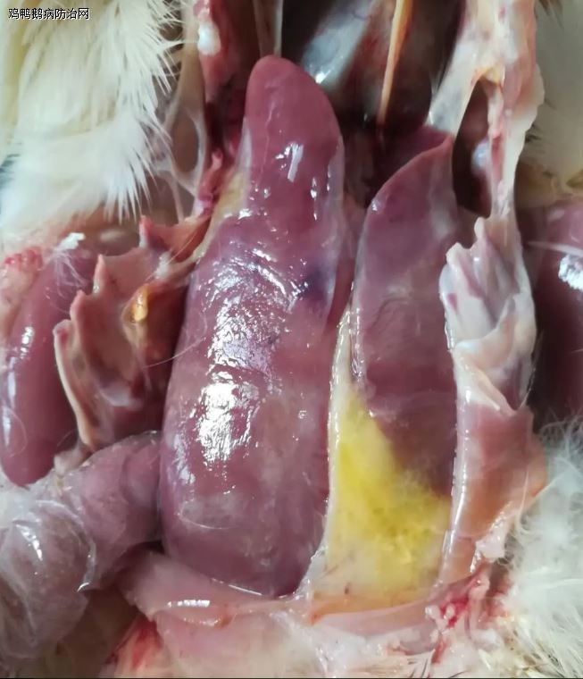 解剖:气管出血十二指肠弥漫性出血,肝脏有出血斑,泄殖腔弥漫性出血,肾脏肿大出现斑点。