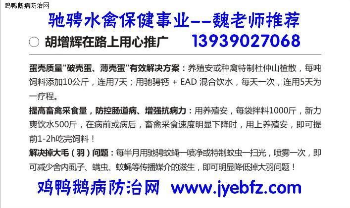 驰骋钙:您身边的补钙专家,2天见效! 1.有效预防“产蛋疲劳症”,即半夜突然发病,两腿僵直后伸,难产、瘫痪等症。2.快速改变蛋壳颜色,发红发亮,好看;3.增加蛋壳厚度,增重;4.减少薄壳蛋、软壳蛋,手触摸鸡蛋手感好,光滑、有质感,提高卖相--驰骋钙。www.jyebfz.com 鸡鸭鹅病防治网 魏老师用心推荐 13939-027-068 微信同步;成龙在路上推广分享 138-3824-8089.
