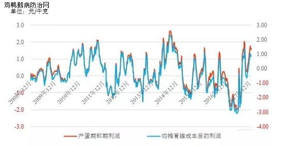 全年产蛋期鸡蛋即期利润(鸡蛋收入减去饲料成本)为亏损0.34元/千克,均摊前期育雏成本后为亏损1.26元/千克。
