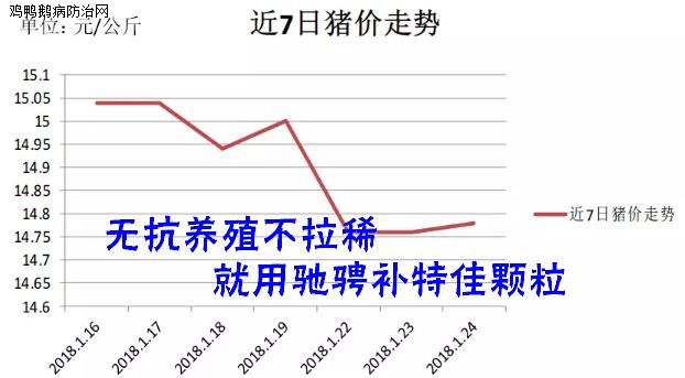 据鸡鸭鹅病防治网监测,2018年1月25日全国外三元生猪均价为15元/kg,较昨日下降0.01元/kg;仔猪均价为30.12元/kg,较昨日持平;今日白条肉均价21.04元/kg,较昨日下降0.01元/kg。今日猪料比价为5.60:1,较昨日持平;猪粮比8.22:1,较昨日减少0.01。